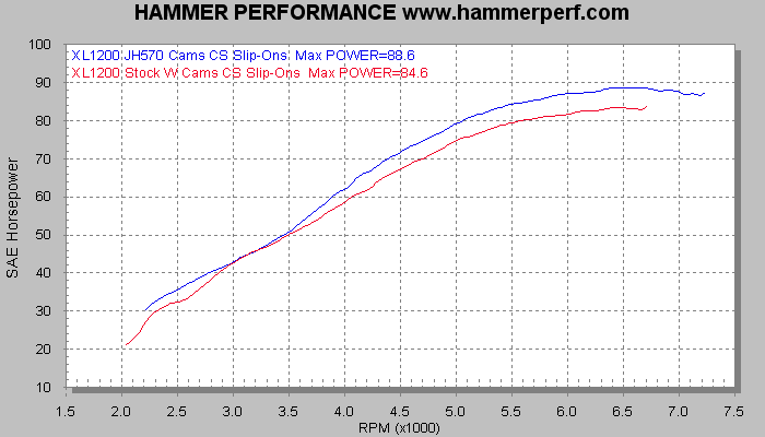 - HAMMER Jackhammer 570 - Bolt-in grind for 2004-up 1200 models. Designed to give a boost in mid range and top end over the factory "W" cams with no loss in bottom end power.